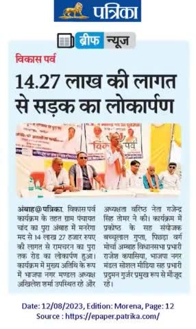 *आज विकास पर्व कार्यक्रम के तहत ग्राम पंचायत चांद का पुरा अम्बाह में मनरेगा मद से राशि 14 लाख 27 हजार रुपए की लागत से चादं का पुरा से रामचरन का पुरा तक रोड के लोकार्पण कार्यक्रम में मुख्य अतिथि के रूप में पधारे भाजपा नगर मण्डल अध्यक्ष अखलेश
