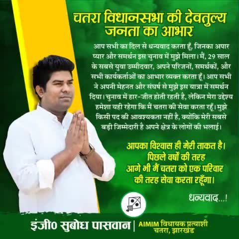 *चतरा विधानसभा की देवतुल्य जनता का आभार* चतरा के प्यारे लोगों, आप सभी का दिल से धन्यवाद करता हूँ, जिनका अपार प्यार और समर्थन इस चुनाव में मुझे मिला।