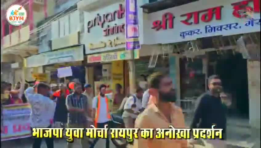रायपुर को गड्ढा पुर कांग्रेस सरकार द्वारा बनाने के विरोध में भाजयुमो रायपुर ने किया अनोखा प्रदर्शन किया गया।