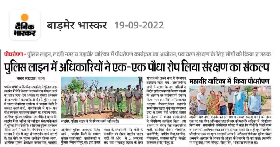 बाड़मेर पुलिस अधीक्षक दीपक भार्गव व ग्रीनमैन ने बाड़मेर पुलिस लाइन में पौधारोपण किया अतिरिक्त पुलिस अधीक्षक नरपत सिंह, बालोतरा अतिरिक्त पुलिस अधीक्षक नितेश आर्य , बाडमेर जिले के समस्त पुलिस वृताधिकारी, थानाधिकारीगण व पुलिस जवान मौजूद रहे