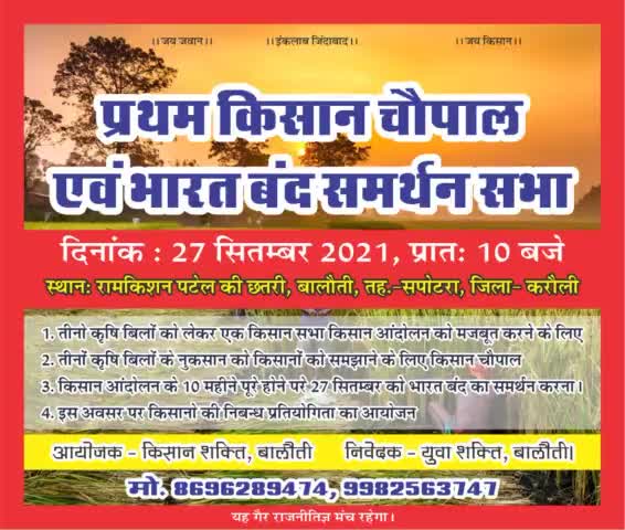 सपोटरा : ग्राम बालौती में प्रातः 10:00 से किसान चौपाल एवं भारत बंद समर्थन सभा का आयोजन रखा आप सभी किसान भाइयों को सूचित