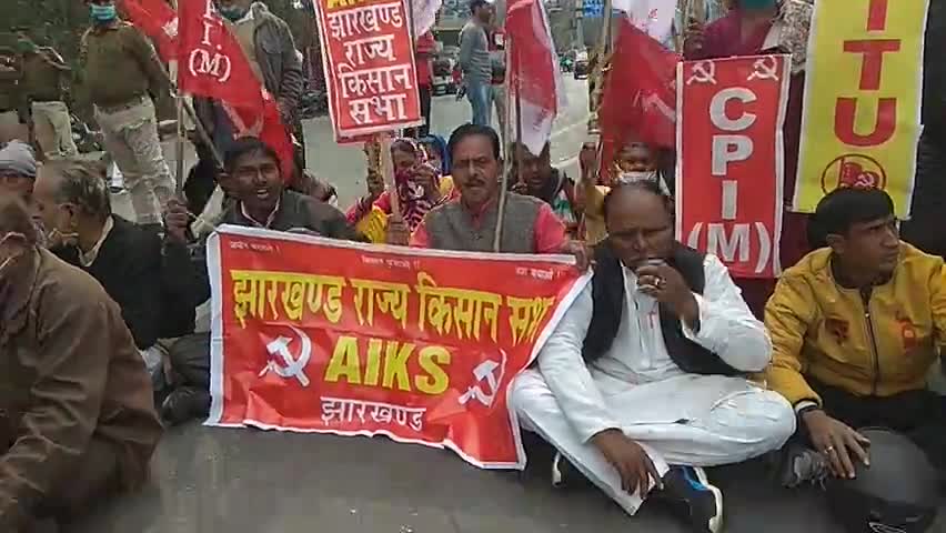 किसान विरोधी काला कानून के खिलाफ झारखंड रांची के बुटी मोङ में रोड जाम करते किसान सभा।