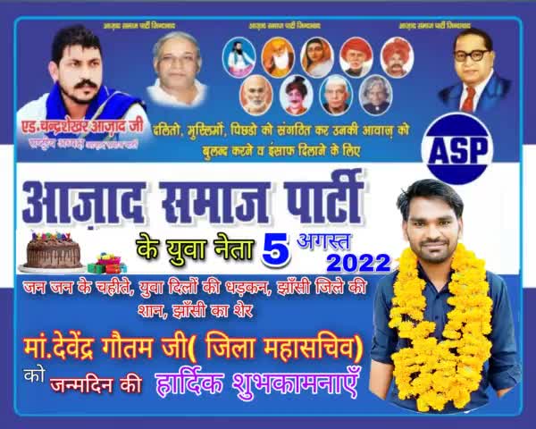 आजाद समाज पार्टी के युवा नेता जन जन के चहीते, युवा दिलों की धड़कन, झांसी जिले की शान झांसी का शेर माननीय देवेंद्र गौतम जी जिला महासचिव को जन्मदिवस की हार्दिक बधाई एवं ढेर सारी मंगलकामनाएं।