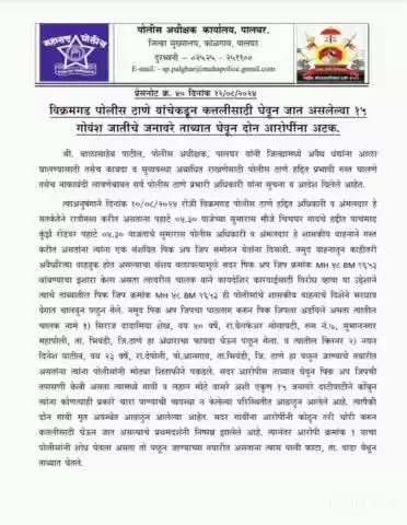 कत्तलीसाठी चोरून घेऊन जाणाऱ्या 15 जनावरांसह दोन आरोपींना विक्रमगड पोलिसांनी केले अटक.