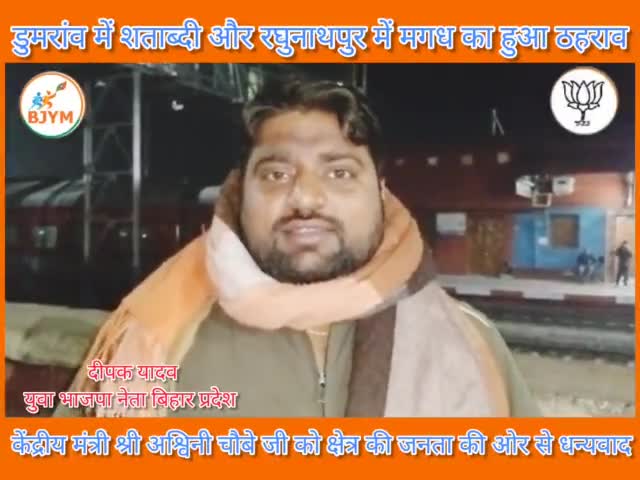 माननीय सांसद श्री अश्विनी कुमार चौबे जी के पहल से डुमरांव में काशी पटना शताब्दी एक्सप्रेस और रघुनाथपुर में मगध एक्सप्रेस का हुआ ठहराव- युवा भाजपा नेता दीपक यादव
