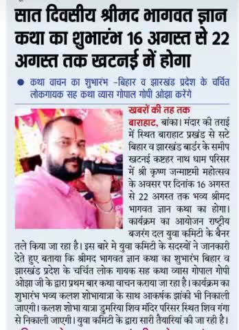 गोड्डा प्रखंड के खटनई पंचायत में 16 अगस्त से 22 अगस्त 2022भागवत कथा का आयोजन किया जाएगा कथा प्रवक्तापंडित गोपालभाई ओझा।
