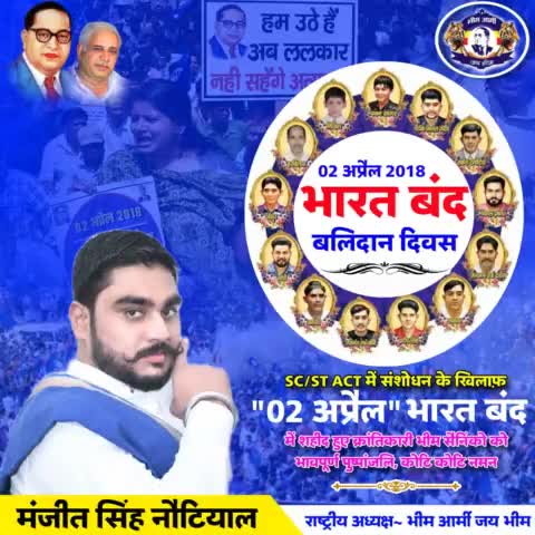 2 अप्रैल को शहीद हुए क्रान्तिकारी भीम सैनिकों के सम्मान में पुरे देश में कैंडल मार्च निकाले जाएंगे। आचार संहिता का पालन करते हुए अपने क्षेत्र के प्रशासन को सूचना देकर पुलिस की सुरक्षा मे कार्यकर्म करेंगे। भीम आर्मी जय भीम राष्ट्रीय अध्यक्ष