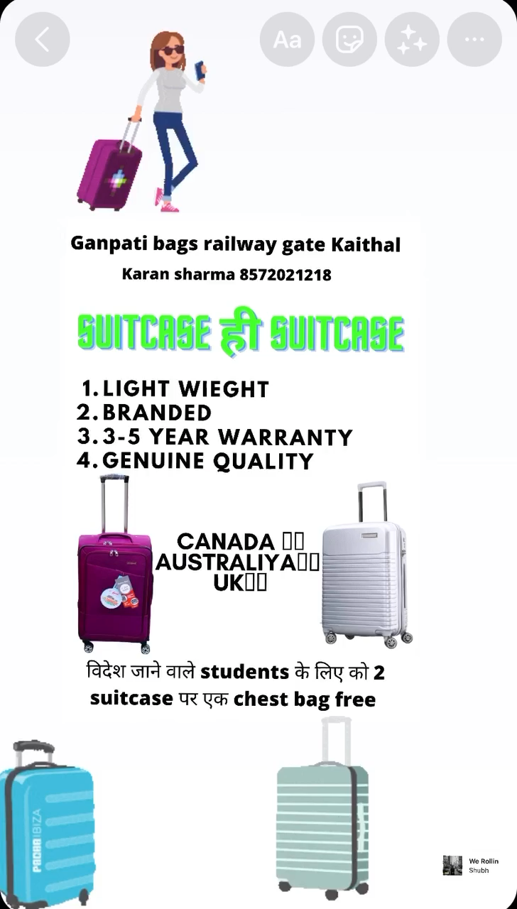 विदेश जाने वाले लोगों व बच्चों के लिए लाइट वेट वाले फ़ैन्सी सूट्केस उपलब्ध है जायज़ रटों पर Ganpati bags railway gate काका पकोड़े वाले के सामने 8572021218