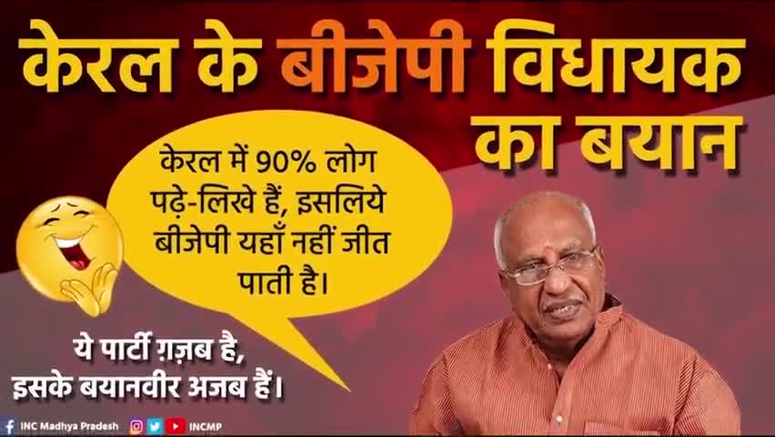 केरल के बीजेपी विधायक का बयान- —केरल में 90% लोग पढ़े-लिखे हैं, इसलिये बीजेपी यहाँ नहीं जीत पाती है।