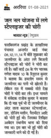 फारबिसगंज प्रखंड के हलहलिया पंचायत के वार्ड 8,10,11,14 में बीते शुकरवार को जलमिनार अंदर लगे बिजली स्टेप्लेजर की चोरी।।