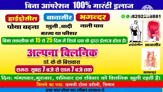बिना चीरफाड़ गारंटी इलाज।हाईड्रोसील,बावासीर,भगन्दर स्थान: दरौली।