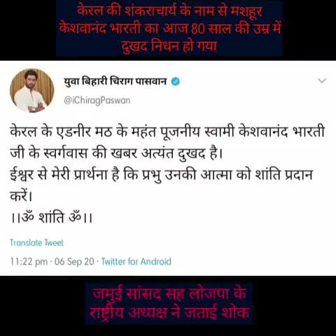 जमुई: केरल की शंकराचार्य के नाम से मशहूर केशवानंद भारती का दुखद निधन हो गया । जमुई सांसद ने जताई शोक । #चिराग_पासवान