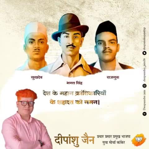 मातृभूमि की आज़ादी के लिए हँसते-हँसते अपने प्राणों का उत्सर्ग करने वाले अमर शहीद भगत सिंह, सुखदेव और राजगुरू जी के बलिदान दिवस पर कोटि-कोटि नमन।