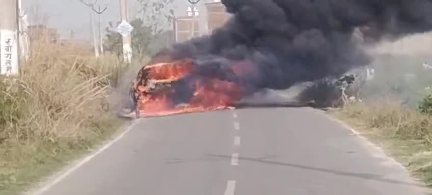 #कुशीनगर • सड़क पर दौड़ती कार बनी आग का गोला • आग से कार जलकर खाक