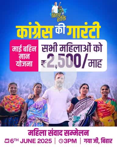 बिहार की शक्ति को है कांग्रेस की गारंटी: प्रगति की, सम्मान की, न्याय की! सभी महिलाओं को माई बहिन मान योजना से ₹2500/माह की समर्थन राशि सीधा उनके बैंक खातों में मिलेगी। गरीबों के मसीहा रियल हीरो न्याय योद्धा श्री राहुल गांधी जी कल गया जी,
