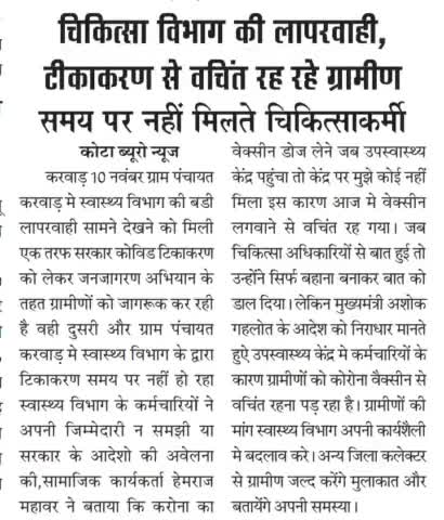 #करवाड़ चिकित्सा विभाग की लापरवाही, कोविड टिकाकरण से वचिंत रह रहे ग्रामीण समय पर नहीं मिलते चिकित्साकर्मी