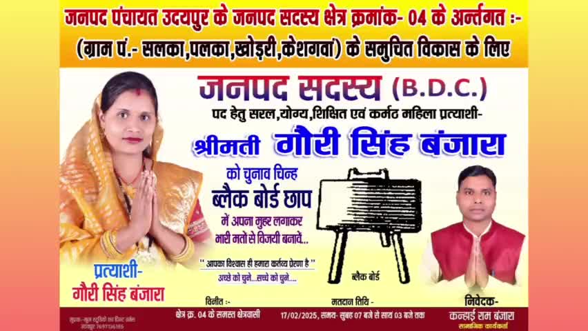BDC पद हेतु गौरी कन्हाई राम बंजारा को ब्लैक बोर्ड छाप में वोट देकर भारी मतों से विजयी बनायें-कन्हाई राम बंजारा