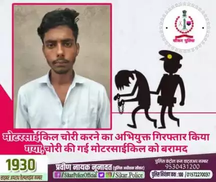 #सीकर 🔸मोटरसाईकिल चोरी करने का अभियुक्त गिरफ्तार किया गया,चोरी की गई मोटरसाईकिल को बरामद #थाना_उद्योगनगर #TeamSikarPolice #भारतीय_न्याय_संहिता