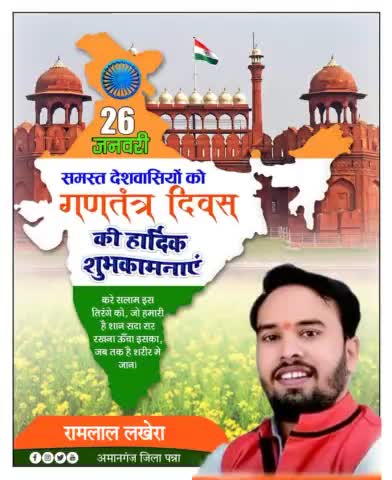 *कुछ नशा तिरंगे की आन का है ,* *कुछ नशा मातृभूमि की शान का है ,* *हम लहरायेंगे हर जगह ये तिरंगा , नशा ये हिन्दुस्तान के सम्मान का है ..* ।।जय हिन्द जय भारत।। आप सभी देश वासियों को गणतंत्र दिवस की हार्दिक शुभकामनाएँ