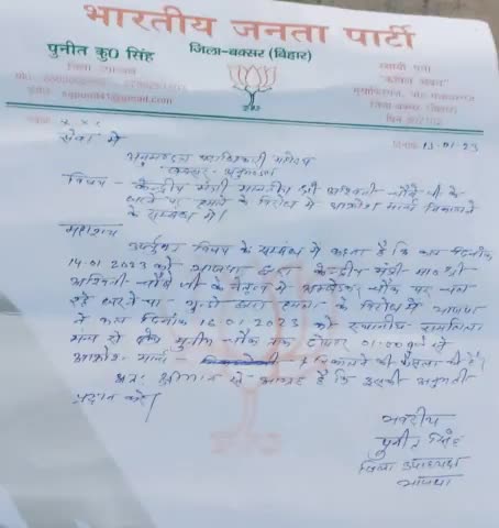 माननीय श्री अश्विनी कुमार चौबे जी के ऊपर हुए हमले के विरोध में आक्रोश मार्च निकालने के संबंध में दिया गया एसडीओ साहब को लेटर