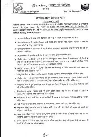 जिला प्रशासन, पटना द्वारा दशहरा एवं रावण वध कार्यक्रम के अवसर पर लोगों की सुविधा को ध्यान में रखते हुए ट्रैफिक प्लान जारी किया गया है। आम जनता से जनहित में अपील है कि इसका अनुपालन करें। #Dussehra #Dussehra2025 #DussehraMahotsav