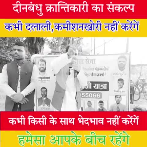 दीनबंधु क्रान्तिकारी का तीन संकल्प,, • हमेसा आपकी बीच सुलभता से उपलब्ध रहेंगे। • कभी भी चोरी/दलाली/भ्रष्टाचार से समझौता नहीं। • कभी जाती/धर्म के आधार पर भेदभाव नहीं।
