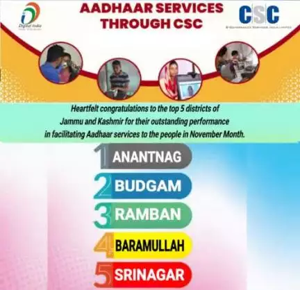Heartfelt congratulations to the top 5 districts of Jammu and Kashmir for their outstanding performance in facilitating Aadhaar services to the people in November.....