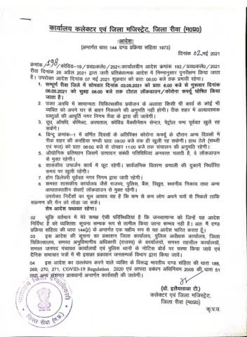 #आवश्यक_सूचना #कोरोना संक्रमण की चैन तोड़ने के उद्देश्य से सम्पूर्ण रीवा जिले में 06 मई सुबह 06 बजे तक रहेगा टोटल lockdo