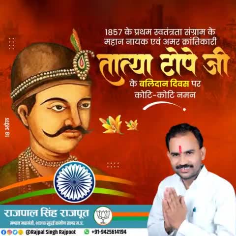 1857 के प्रथम स्वतंत्रता संग्राम के महान नायक एवं अमर क्रांतिकारी #तात्या_टोपे जी के बलिदान दिवस पर कोटि कोटि नमन।