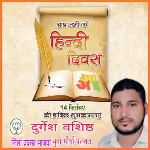 सभी देशवासियों को हिंदी दिवस की बहुत बहुत बधाई और शुभकामनाएं । दुर्गेश वशिष्ठ भाजपा जिला प्रवक्ता पलवल
