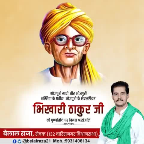 भोजपुरी भाषा को पूरे विश्व में सम्मान दिलाने वाले लोक कला के महान नाटककार, कवि, रचनाकार, 'भोजपुरी के शेक्सपीयर' कहे जाने वाले, भोजपुरी नाच विधा से सामाजिक संदेश वाहक महान लोक कलाकार भिखारी ठाकुर जी की पुण्यतिथि पर विनम्र श्रद्धांजली।