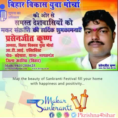 समस्त देशवासियों को मकर सक्रांति की हार्दिक शुभकामनाएं. आपका प्रसेनजीत कृष्ण अध्यक्ष सह पूर्व विधायक प्रत्याशी Araria