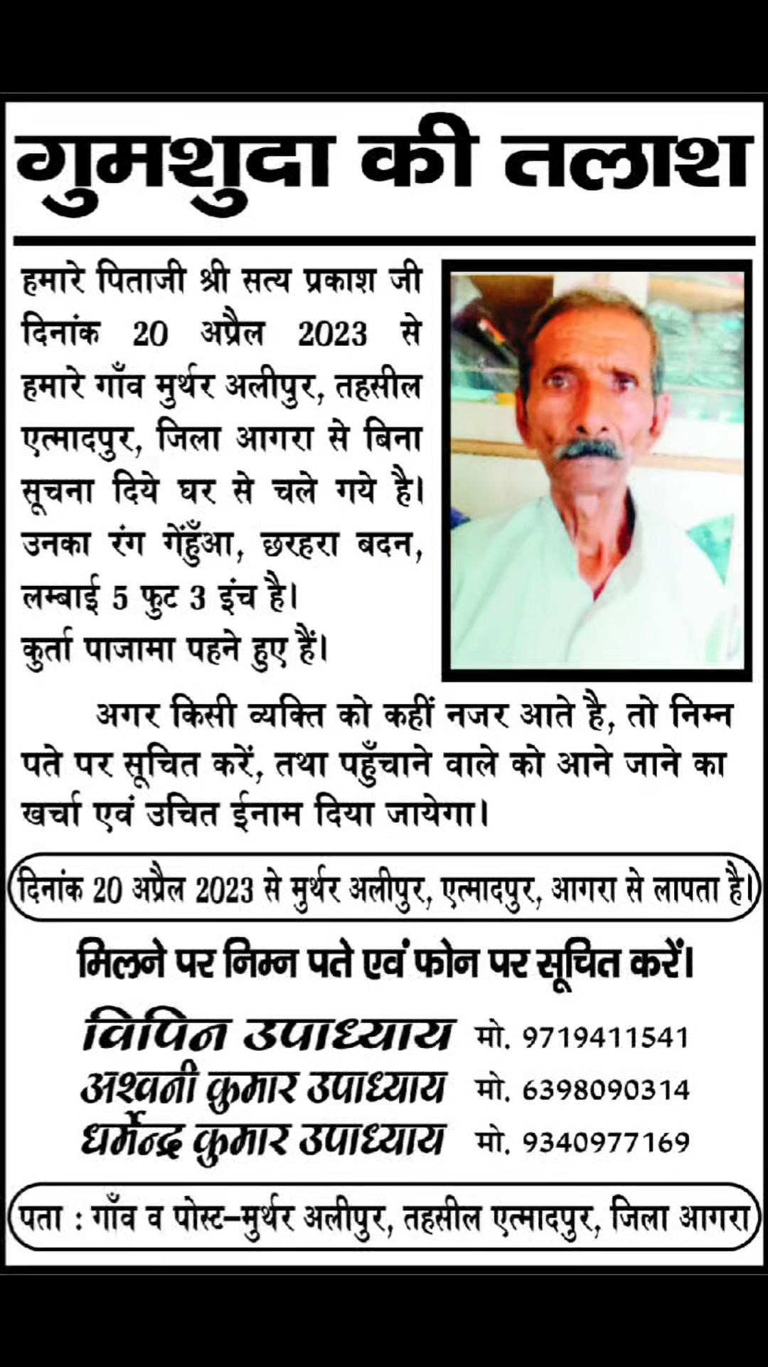 एत्मादपुर: किसीको भी इनका कुछ पता चले तो दिए हुई फ़ोन नंबर पर संपर्क करे .पता बताने वाले को उचित इनाम दिया जायेगा 🙏🙏#newstoday