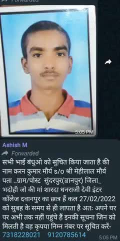sundra pur ka ladka kai dino se lapta hai kisi ko koi jankari mile is number8543033104 pr suchit kare