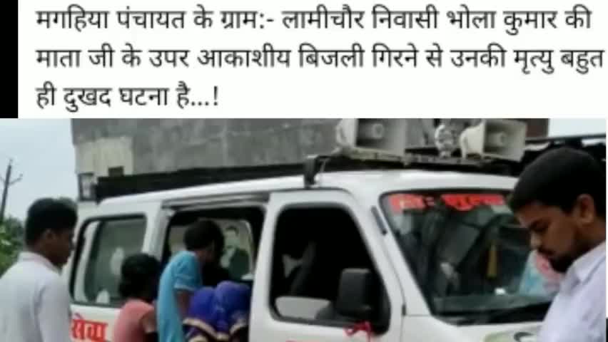 मगहिया पंचायत के ग्राम : - लामीचौर निवासी भोला कुमार की माता जी के उपर आकाशीय बिजली गिरने से उनकी मृत्यु