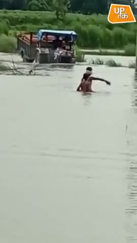 औरैया में यमुना नदी में बढ़ते जलस्तर का कहर। पानी की चपेट में आया ईंटों से भरा ट्रैक्टर।