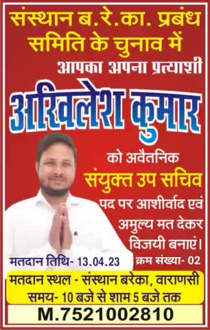 संस्थान बरेका वाराणसी के प्रबंध समिति के चुनाव में अवैतनिक संयुक्त उप सचिव के पद पर अखिलेश कुमार को विजई बनाएं