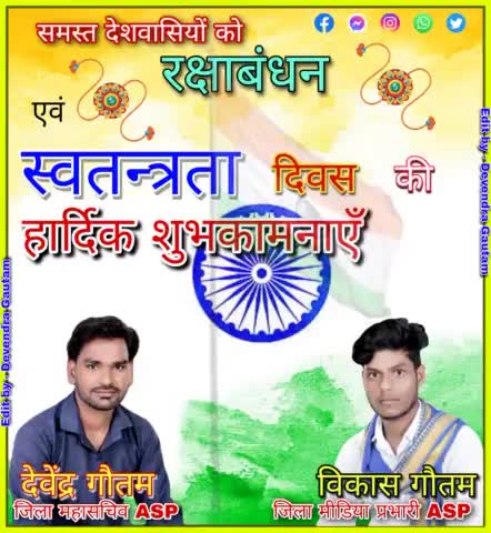 सभी देशवासियों एवं क्षेत्रवासियों को रक्षाबंधन की एवं स्वतंत्रता दिवस की हार्दिक बधाई। विकास गौतम