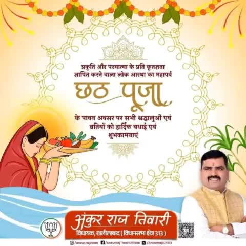 सदर विधायक अंकुर राज तिवारी ने छठ पर्व पर सभी श्रद्धालुओं व्रतियों को दी हार्दिक बधाई एवं शुभकामना