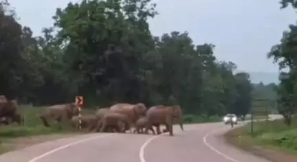 कटघोरा वन मंडल बंजारी गांव के पास हाईवे पार करते दिखे 46 हाथियों का झुंड, वाहनों की लगी लंबी कतार..