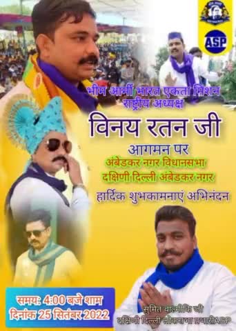 भीम आर्मी आजाद समाज पार्टी दक्षिणी दिल्ली लोकसभा अंबेडकर विधानसभा में अंबेडकर पार्क भीम आर्मी राष्ट्रीय अध्यक्ष विनय रतन सिंह जी पहली बार आगमन होने जा रहा है! राष्ट्रीय अध्यक्ष विनय रतन सिंह जी पहुंच रहे हैं,शाम समय 4:00 25/9/2022 को जन सभ