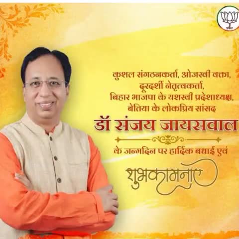 भारतीय जनता पार्टी बिहार के माननीय प्रदेश अध्यक्ष बेतिया से सासंद डॉक्टर संजय जैसवाल जी को जन्मदिन की हार्दिक बधाई एव शुभकामनाये । आप स्वास्थ्य तथा दिर्घायु हो ।