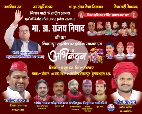 शिकारपुर विधानसभा तहसील पर 1:00 बजे उपस्थित रहेंगे निषाद पार्टी के राष्ट्रीय अध्यक्ष एवं कैबिनेट मंत्री उत्तर प्रदेश सरकार माननीय संजय कुमार निषाद जी