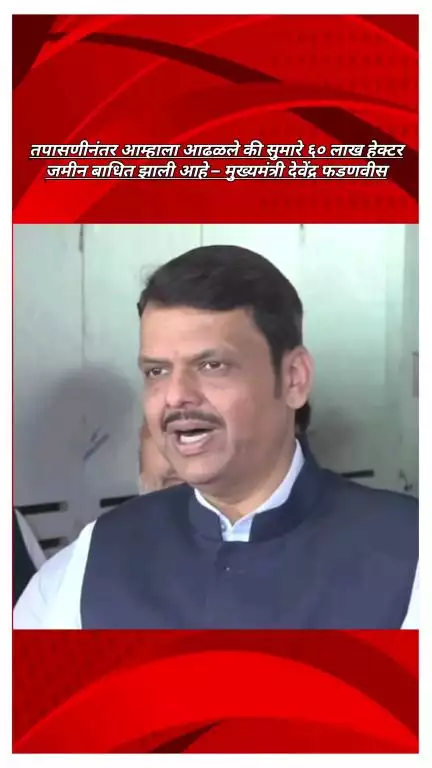 आज मंगळवार दिनांक ३० सप्टेंबर २०२५ रोजी दुपारी २ च्या सुमारास मुख्यमंत्री देवेंद्र फडणवीस यांनी मुंबईत प्रसारमाध्यमांशी संवाद साधलेला आहे. यावेळी ते म्हणाले की, आज मंत्रिमंडळाची बैठक झाली आणि काही महत्त्वाचे निर्णय घेण्यात आले. विशेषतः आम्ही महाराष्ट्रातील पूरसदृश परिस्थितीचा आणि शेतकऱ्यांच्या झालेल्या नुकसानाचा आढावा घेतला. तपासणीनंतर आम्हाला आढळले की सुमारे ६० लाख हेक्टर जमीन बाधित झाली आहे.