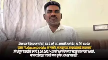 विनायक सिताराम डोंगरे, वय ५ वर्ष, रा. वाळकी जहांगीर, ता. वाशीम यांना Thalassemia Major या गंभीर आजाराच्या उपचारासाठी पंतप्रधान सहाय्यता निधीतून तातडीने रुपये ३,००,०००/- इतकी आर्थिक मदत मंजूर करण्यात आली. या मदतीबद्दल त्याच्या वडिलांनी खा. संजय देशमुख यांचे दि 5 ऑक्टोबर रोजी आभार व्यक्त केले आहेत.