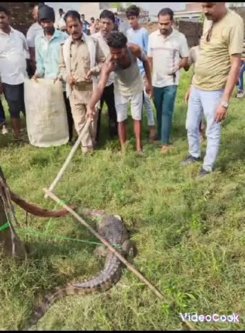 नगीना: ग्राम कोटकादर में आबादी के पास तालाब में निकला मगरमच्छ, जिसे गांव वालो की मदद से वन विभाग कर्मचारी महबूब भाई ने पकड़ा,
