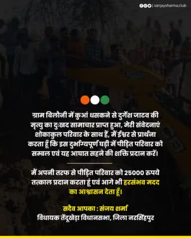 ग्राम बिलौनी में कुआं धसकने से दुर्गेश जाटव की मृत्यु का दुःखद सामाचार प्राप्त हुआ। मेरी संवेदनाएं शोकाकुल परिवार के साथ हैं। ईश्वर पीड़ित परिवार को सम्बल एवं यह आघात सहने की शक्ति दें। मै पीड़ित परिवार को तत्काल 25000 रुपये प्रदान करता हूँ।