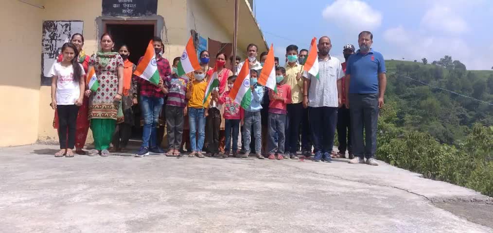 ग्राम पंचायत गलोट में 75वें स्वतंत्रता दिवस पर राष्ट्रीय गान गाते हुए पंचायत के प्रतिनिधि और स्थानीय लोग।