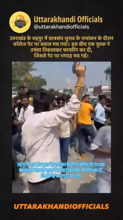 उत्तराखंड के रुद्रपुर में छात्रसंघ चुनाव के नामांकन के दौरान कॉलेज गेट पर बवाल मच गया। इस बीच एक युवक ने तमंचा निकालकर फायरिंग कर दी, जिससे गेट पर भगदड़ मच गई।”