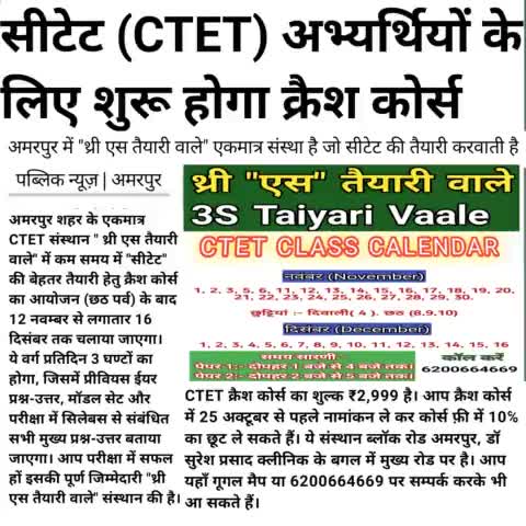CTET तैयारी के लिए शुरू हो रहा है, crash course. ब्लॉक रोड अमरपुर, मुख्य रोड पर है "थ्री एस तैयारी वाले" संस्थान।